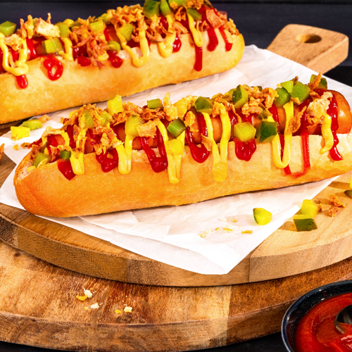 Hotdog Classic met tomatenketchup, mosterd, augurk en gebakken uitjes