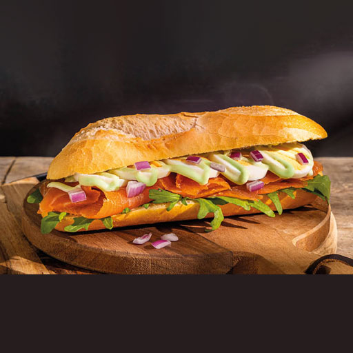 Broodje Zalm Wasabimayonaise; gerookte zalm met romige en lichtpittige wasabimayonaise, rucola, rode ui en een hardgekookt eitje.